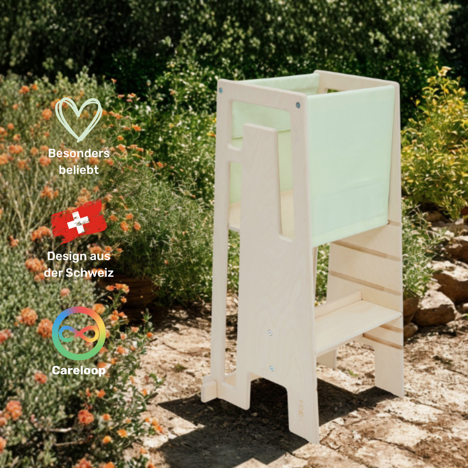 Mit dem Tuki® Entdeckertuch ist der Tuki® Lernturm auf allen vier Seiten geschlossen. So kann der Tuki® Lernturm bereits ab einem Alter von 9 Monaten eingesetzt werden und begleitet Kinder in der besonders intensiven Entdeckerphase bis etwa 24 Monate.