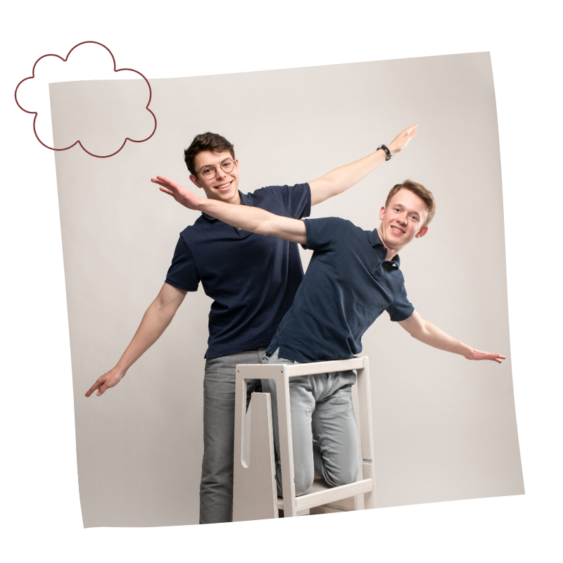 Dank der kleinen Schwester Aline von Dominic, sind die Beiden auf die Idee gekommen, einen Lernturm für sie zu entwickeln. Die kleine «Wundernase» wollte immer alles sehen, überall mit dabei sein, wo ihr grosser Bruder war und am Geschehen teilhaben. Die Idee entstand wohl auch, um sich selbst zu entlasten, denn je grösser das Mädchen wurde, desto mehr Gewicht galt es, hochzuhieven. Also zogen sich die zwei findigen Jungunternehmer Dominic und Simon in die elterliche Garage zurück, um für Aline einen Lernturm zu bauen. Die ersten Exemplare wurden noch aus zugekauften Elementen erstellt und waren für den Versand sperrig und schwer.
